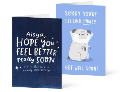 Choose from hundreds of beautiful fonts to use on your card and don't be afraid to use more than one! You can even add in your own handwritten message using our app. And if you want extra brownie points, make it personal by adding your own photos or customizing the text. Once you select an item, suggestions for cards or other gifts to complement it are then made should you want them and, of course, you can add your own personalised messages. You can even add in your own handwritten message using our apps. You will be able to see a preview of your card and write your personal message before sending it. With moonpig you can make someone's day without even leaving the sofa. Unique accents like real foil, attractive stickers and graphics, and pretty backgrounds add a personal touch to your photo cards. Make your greetings even more personal by making your own card! App everything you need to know about the app. Send your best wishes with our selection of unique cards. Make it custom by adding lots of photos, personalizing the text, and writing. If you like the card, it will be sent as premium, without any ads.